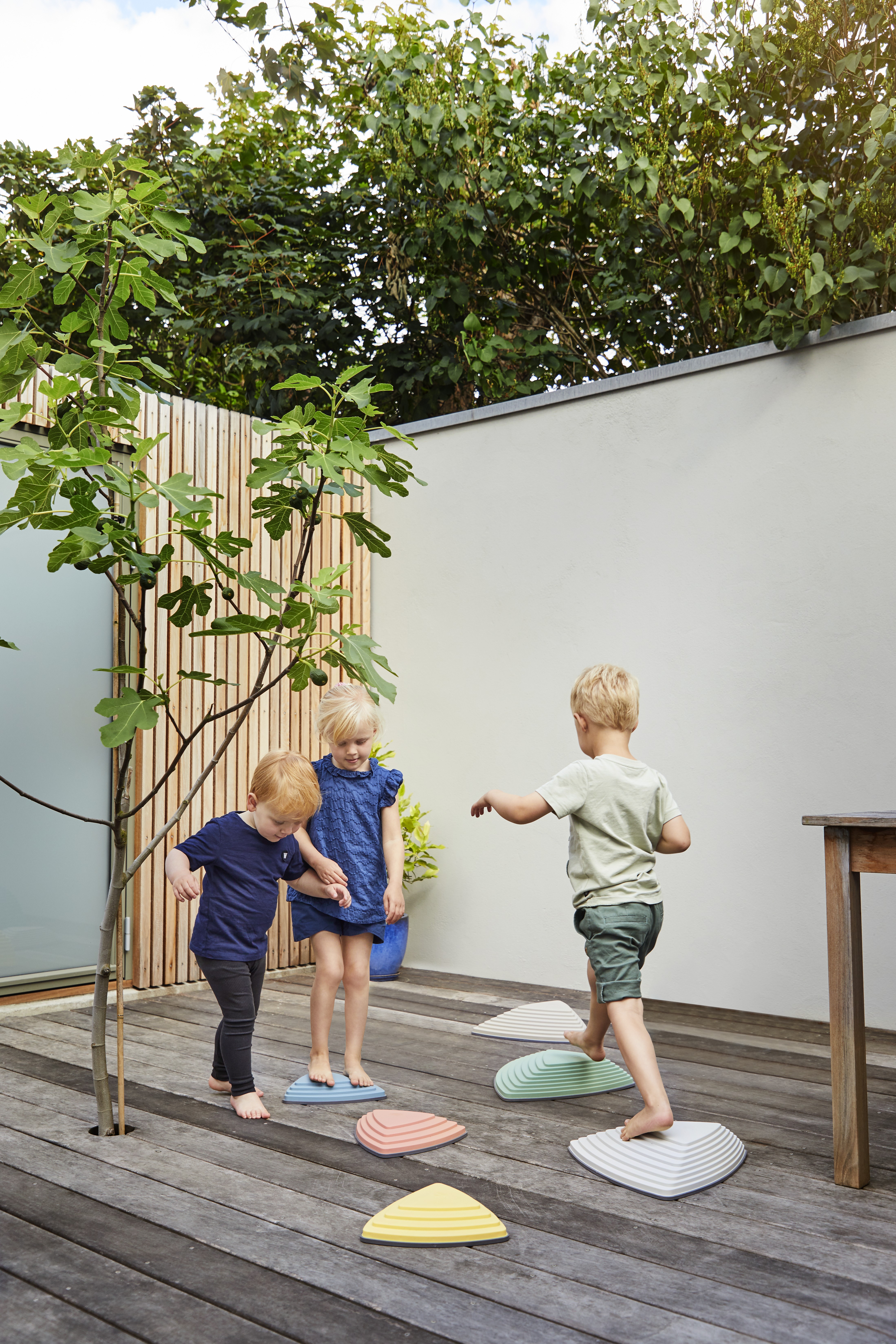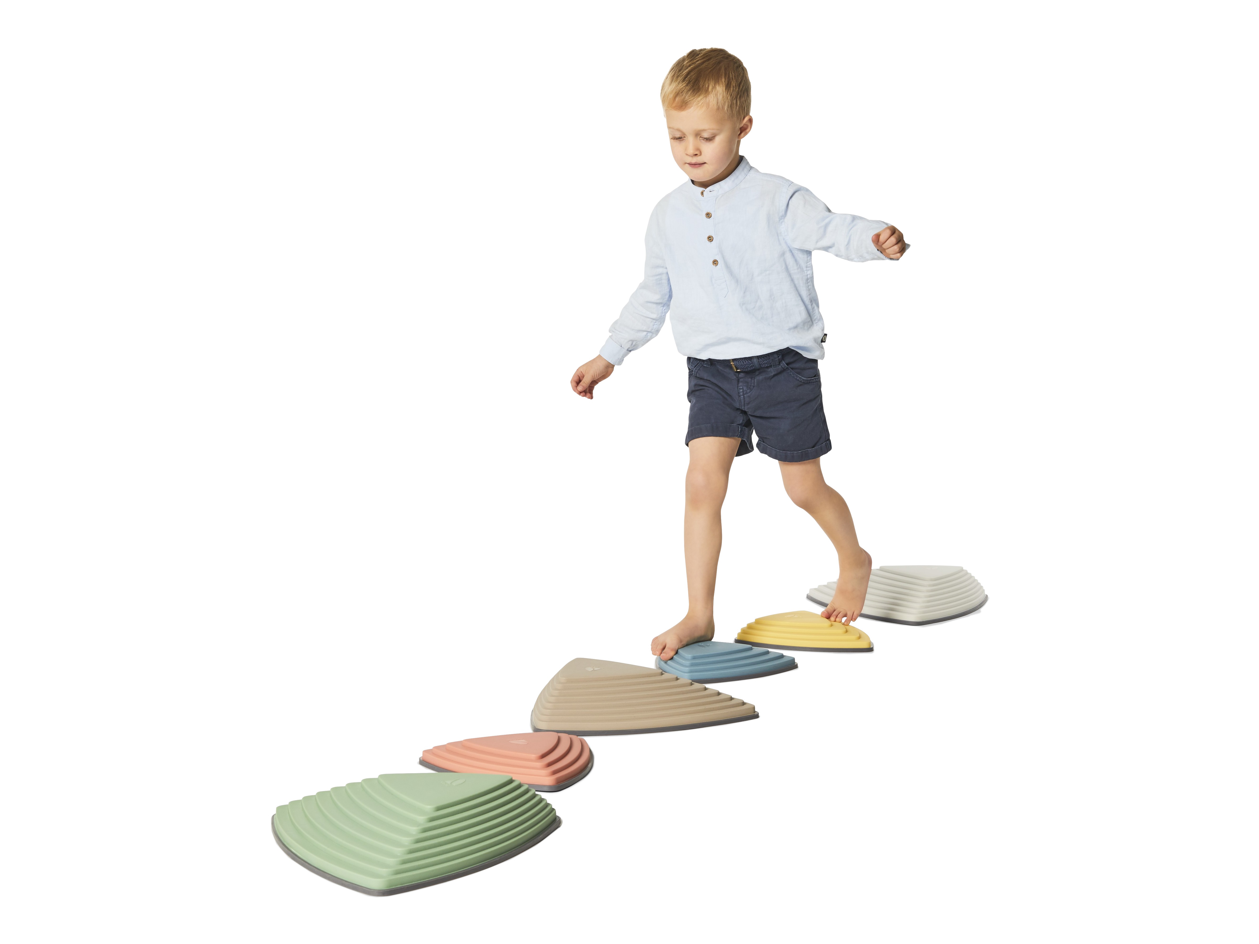 The original, known across generations and a true classic in gross motor development. Inspired by stepping stones in a river, each triangular stone offers a different slope and level of challenge. The aim is to hop from stone to stone without touching the floor; rearrange them to create easier routes or more demanding courses. The calm Nordic palette blends naturally into homes, classrooms, and therapy rooms, adding visual harmony without distraction. Non‑slip rubber rims keep the stones stable and protect indoor floors. Play remains active and imaginative while building children’s confidence in jumping, judging distances, coordination, and balance. The stackable design makes storage straightforward. A trusted choice for physical therapy equipment.