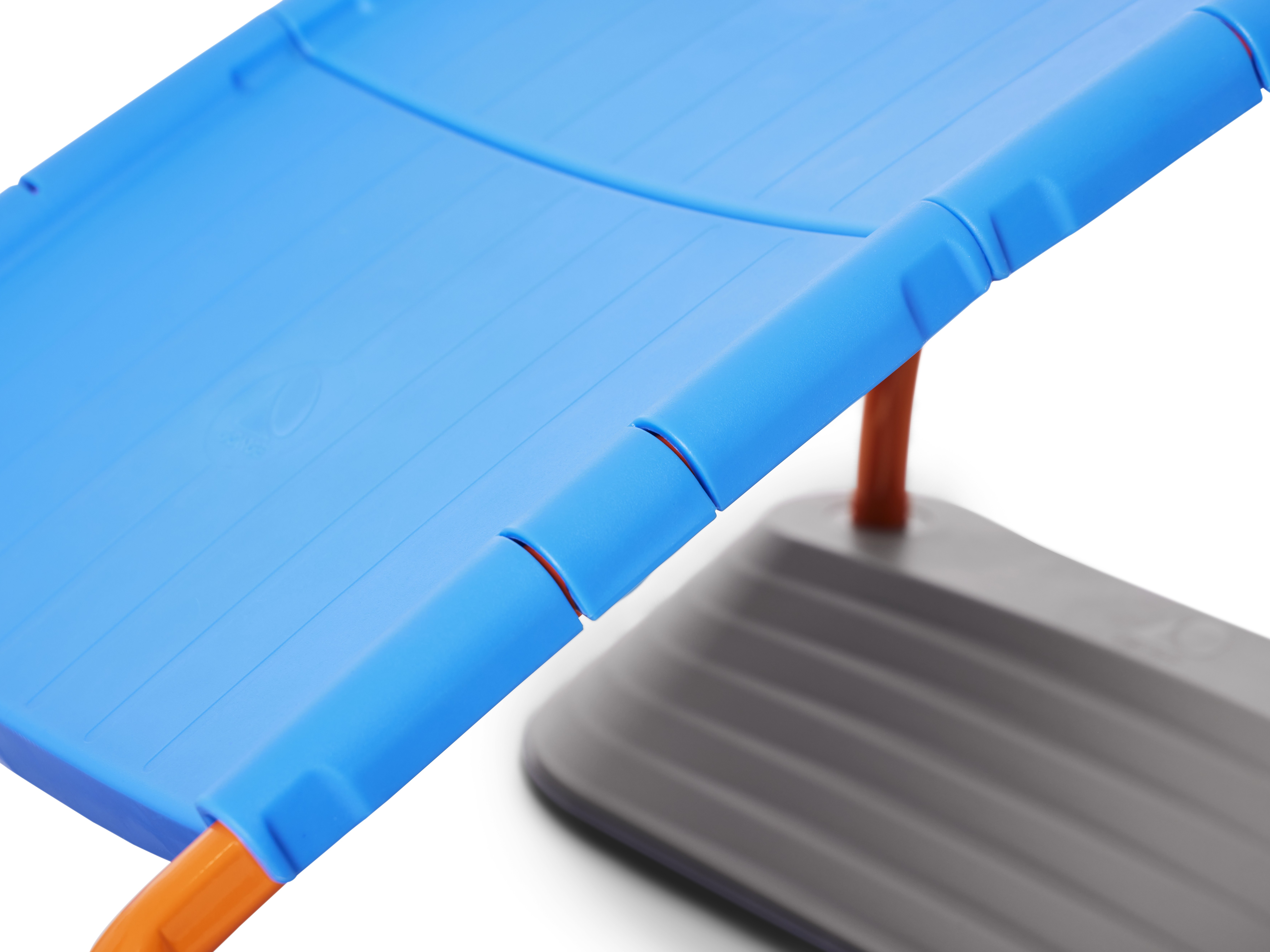 Moulded in one piece from strong PP, Slide offers a continuous, joint-free surface. It attaches securely to the Mini Parkour® – Straight Hurdles and Mini Parkour® – Diagonal Hurdles, with integrated grips that lock it firmly in place.