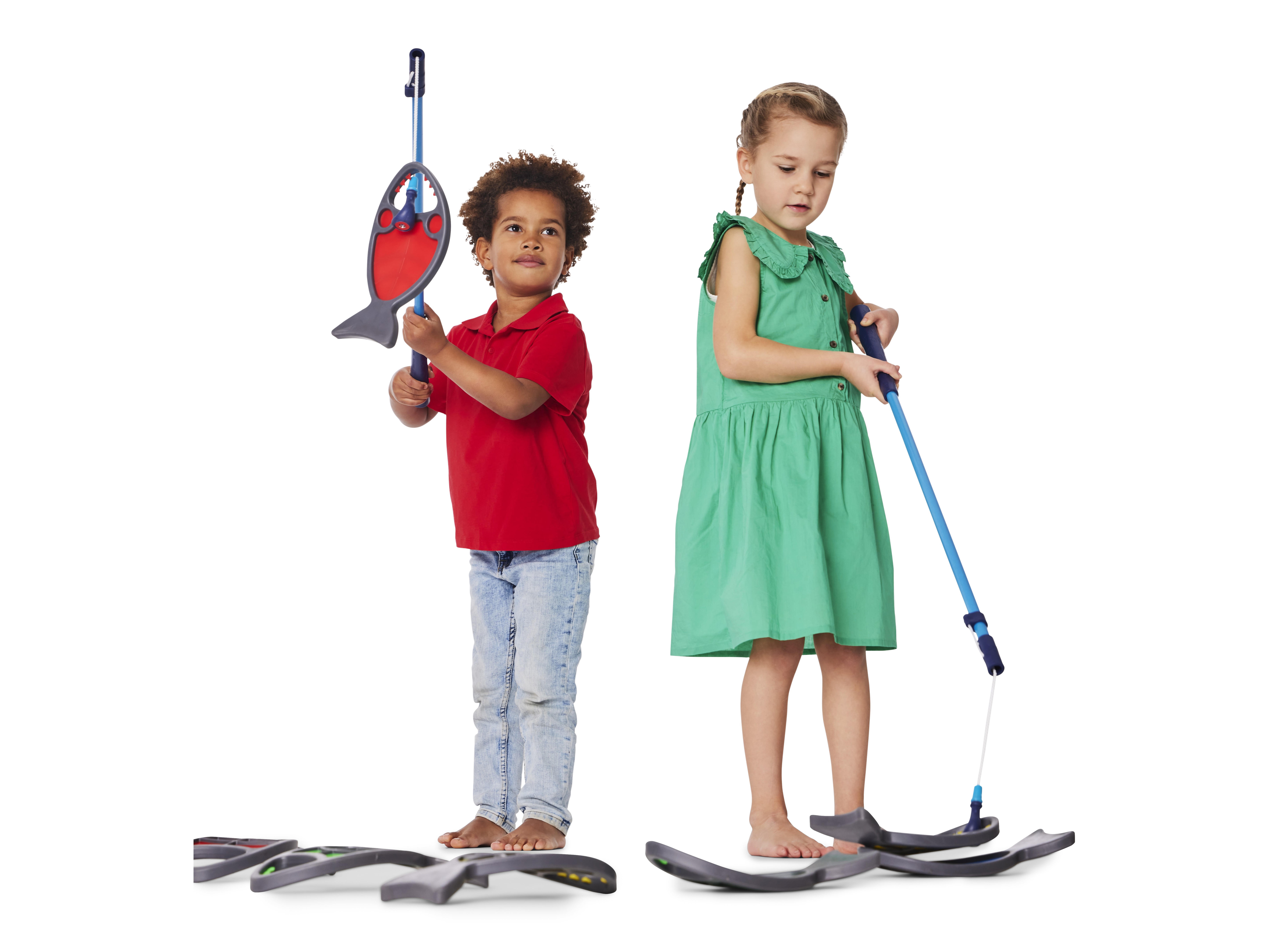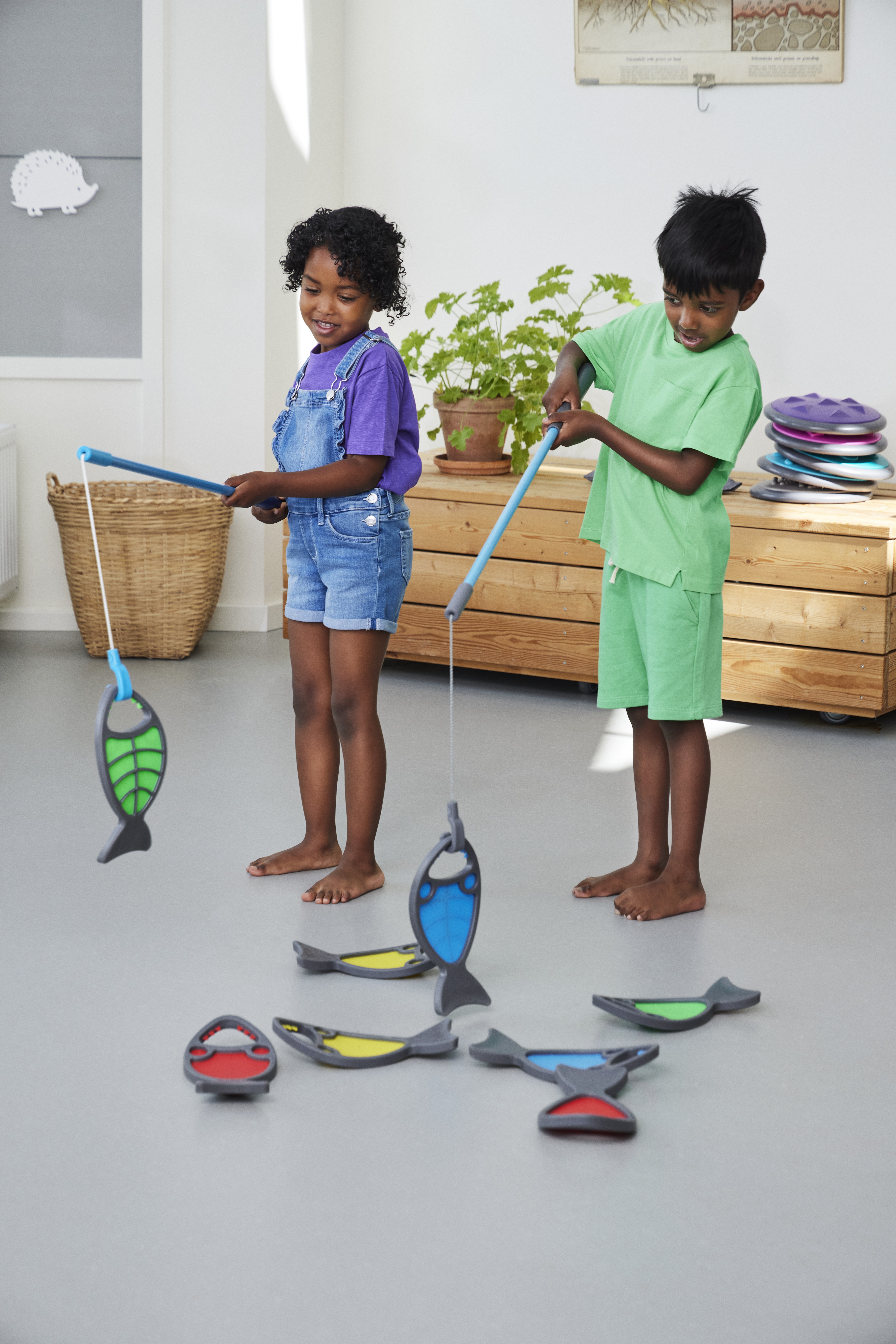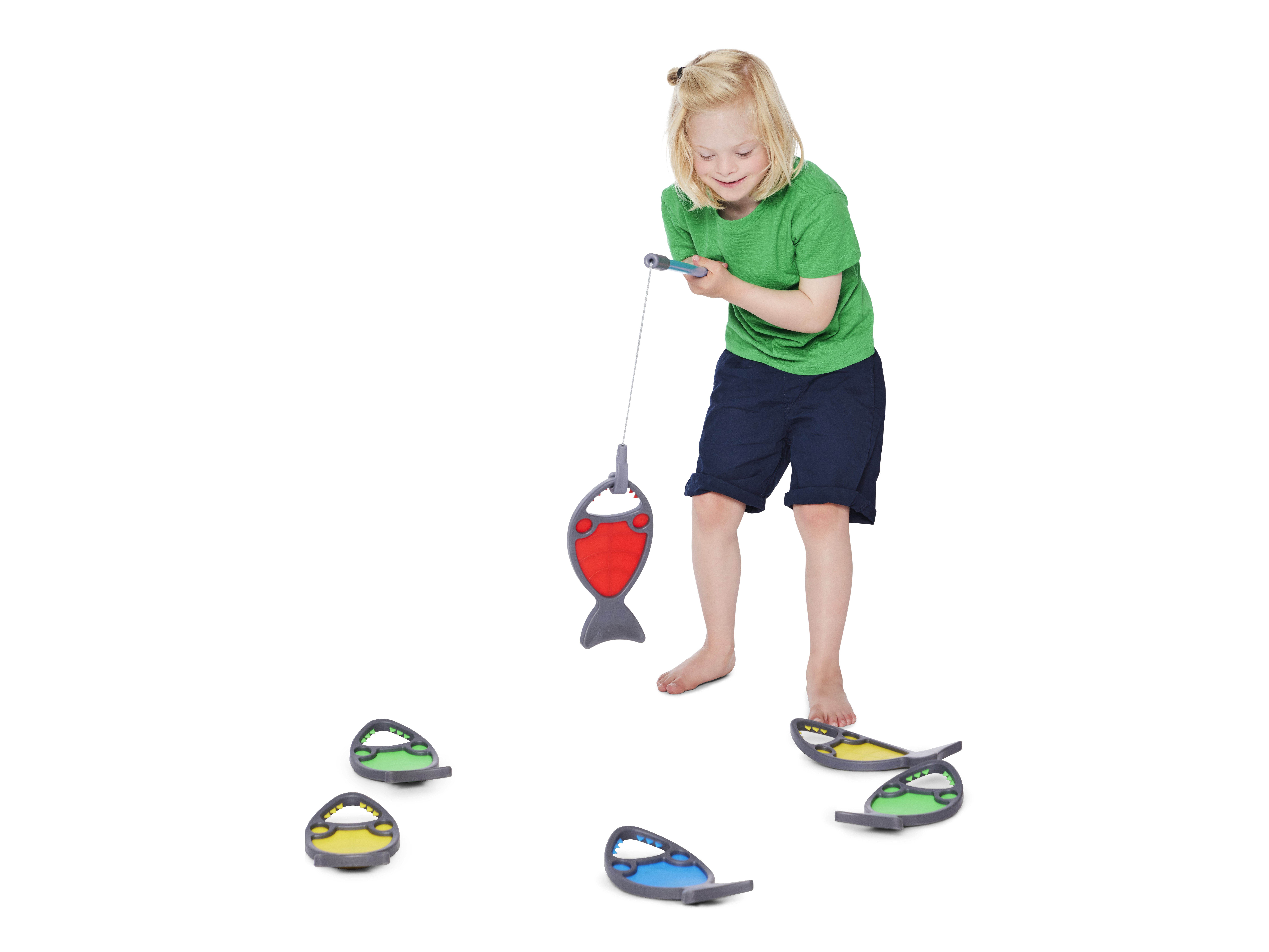 Hungry Fish invite children to aim, hook, and land their catch with the line‑and‑hook on the Fishing Rod (Art. 2315). The mouth opening forms a clear target that rewards steady hands, careful timing, and graded wrist movement. Play develops hand–eye coordination, visual tracking, and precision grip while sustaining attention. Children plan approaches, adjust their technique, and compare results, building problem‑solving, turn‑taking, and lively conversation. Bright colours spark engagement, and the soft, durable bodies sit comfortably in small hands.