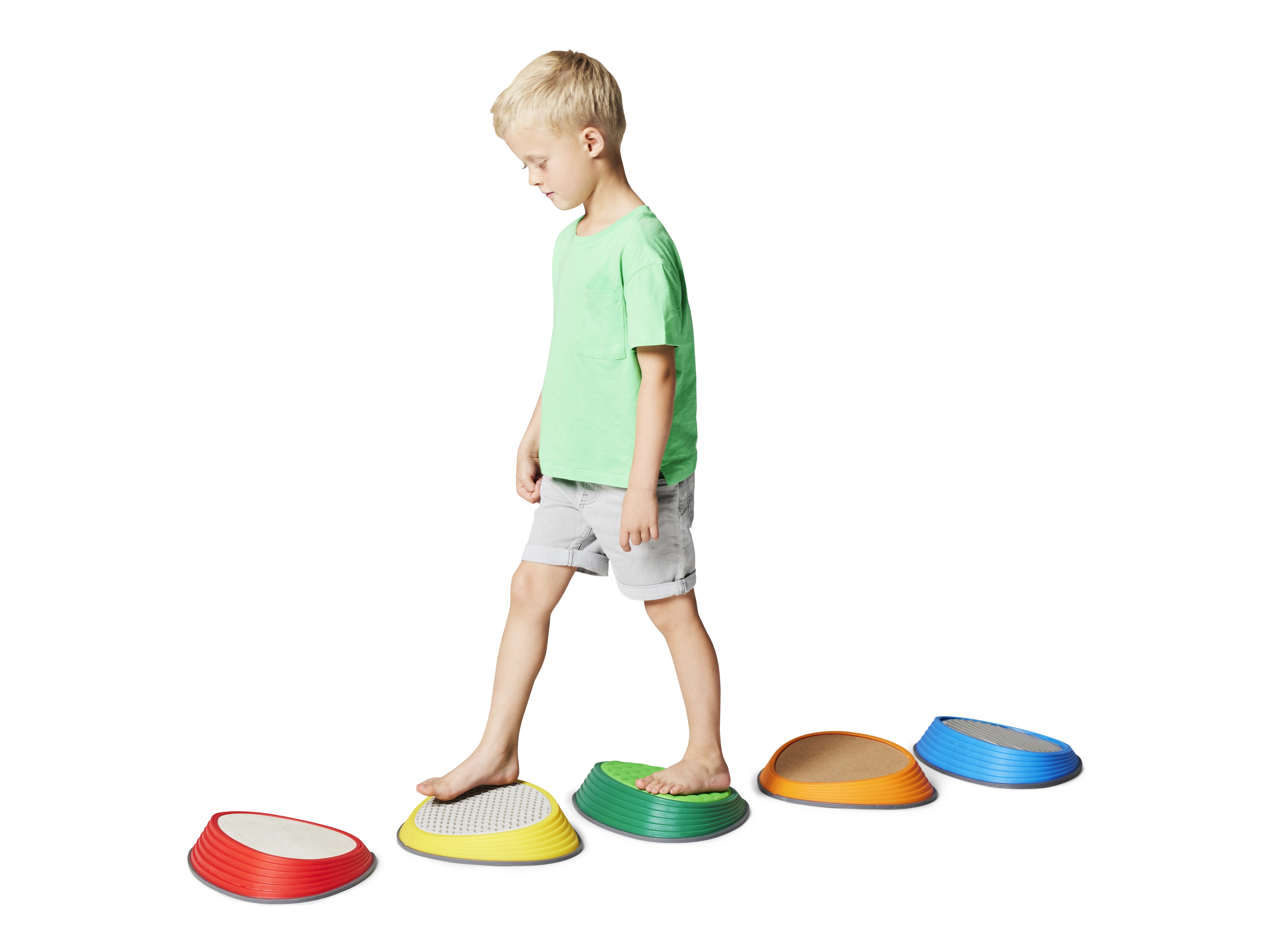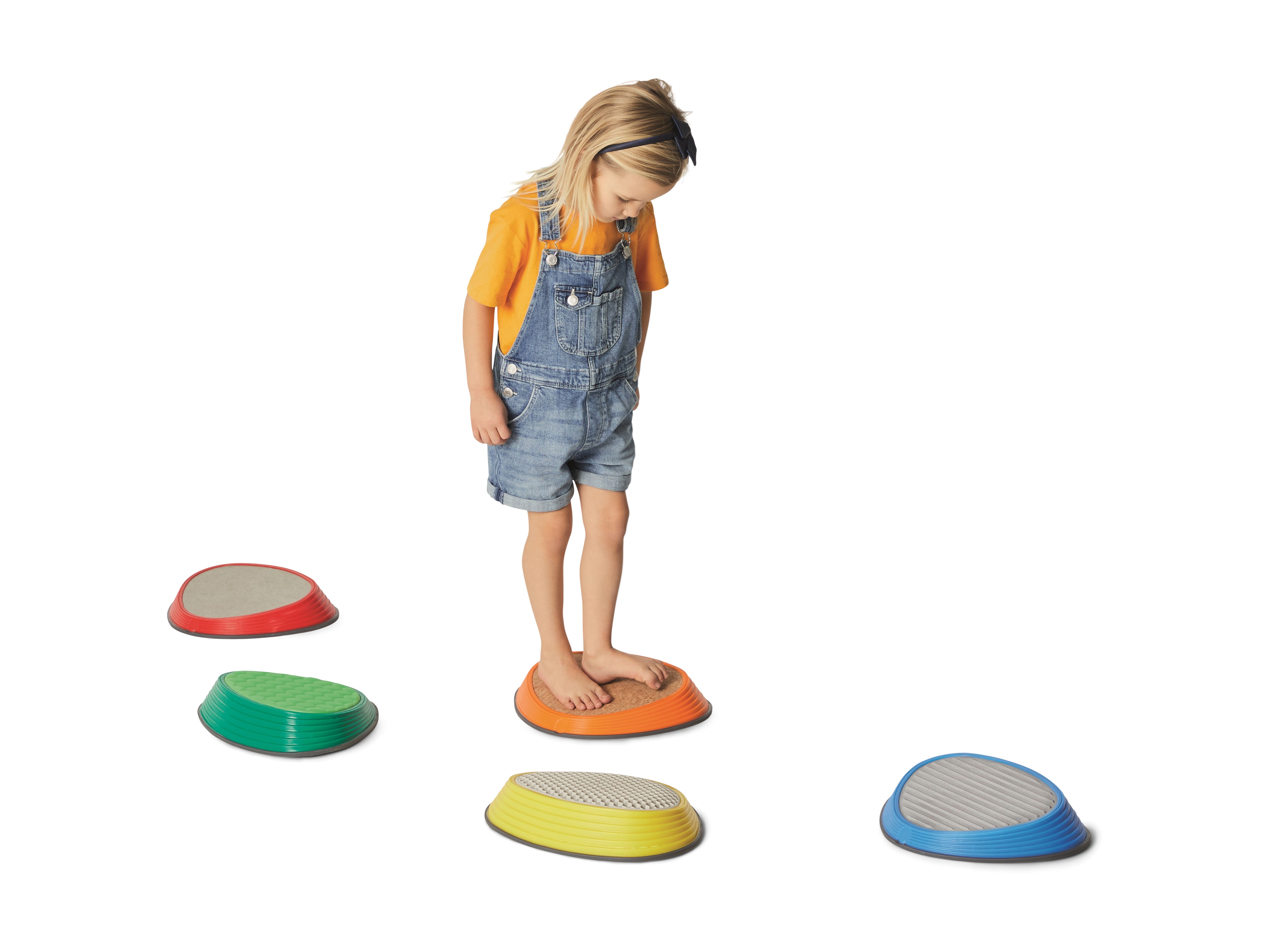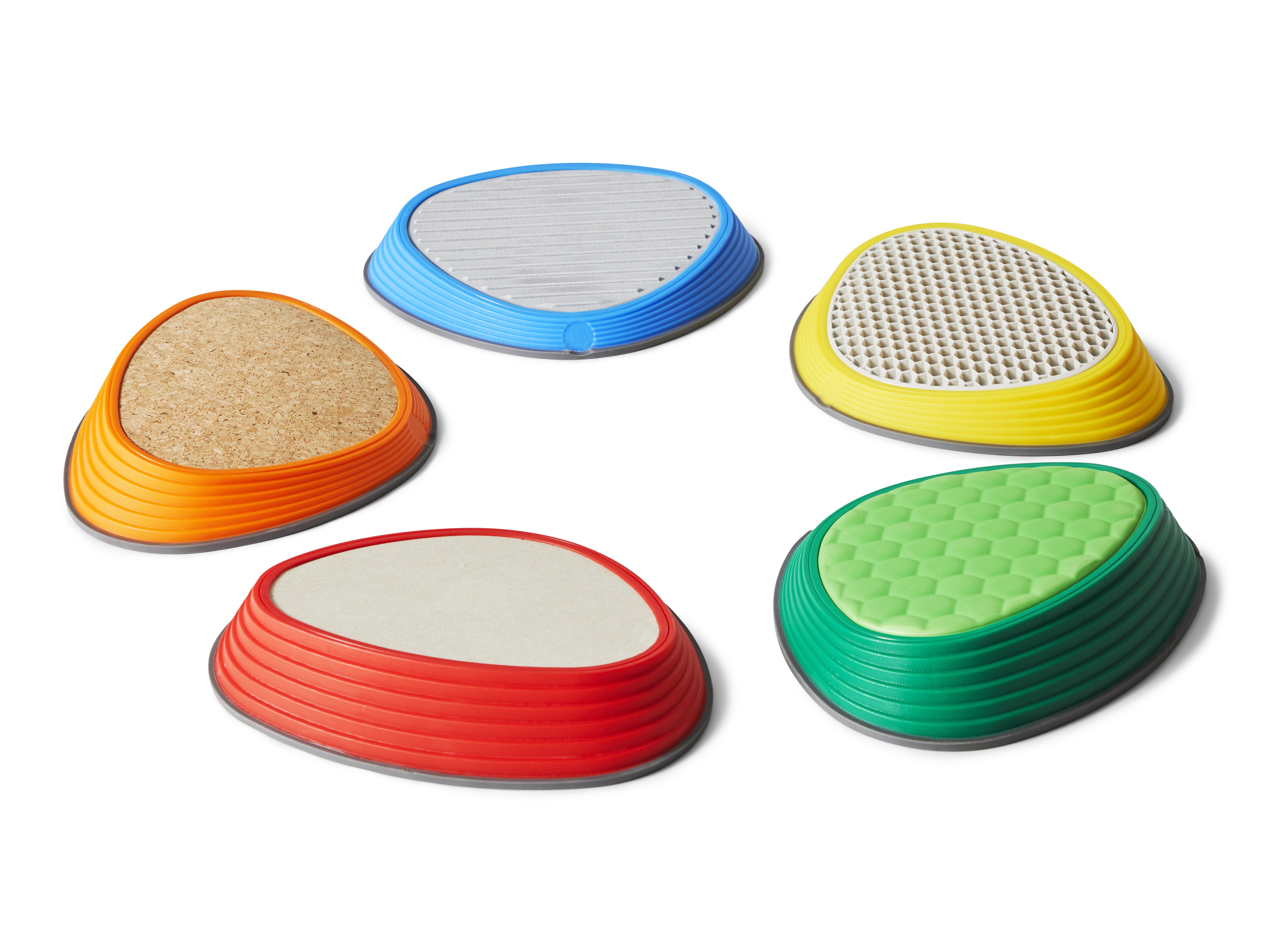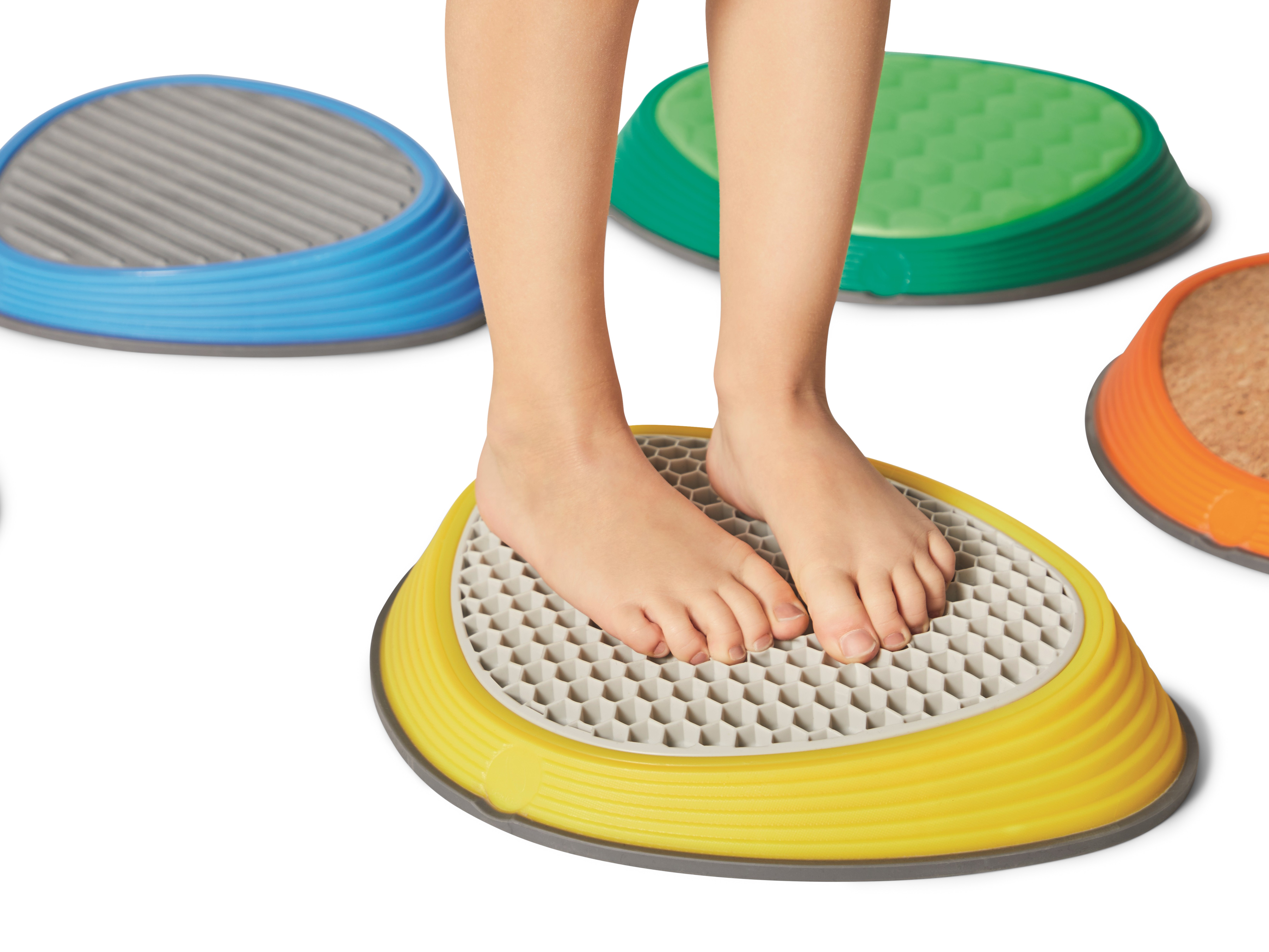 River Stones Tactile Set brings five distinct surfaces into one collection. Each stone features a different material—cork, aluminium, foam, TPE rubber, and concrete—selected for clear contrasts in firmness, temperature, texture, and grip. This variety engages tactile receptors in feet and hands, sharpening discrimination and encouraging confident foot placement. A gentle slope increases forefoot pressure to amplify sensory feedback and support balance, alignment, and motor control. Suitable for free exploration and structured training, the set integrates naturally into play spaces, therapy rooms, and PE sessions.