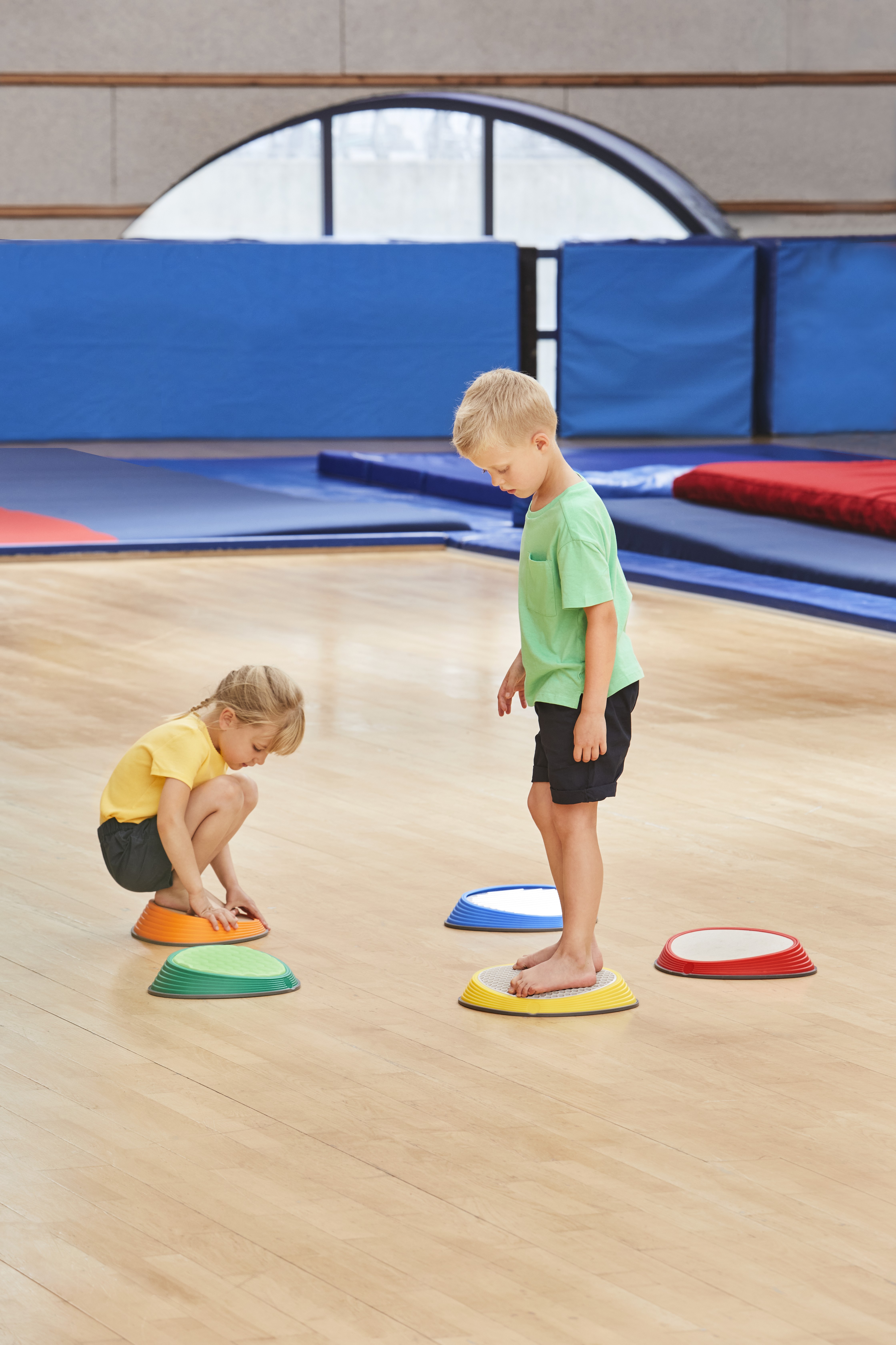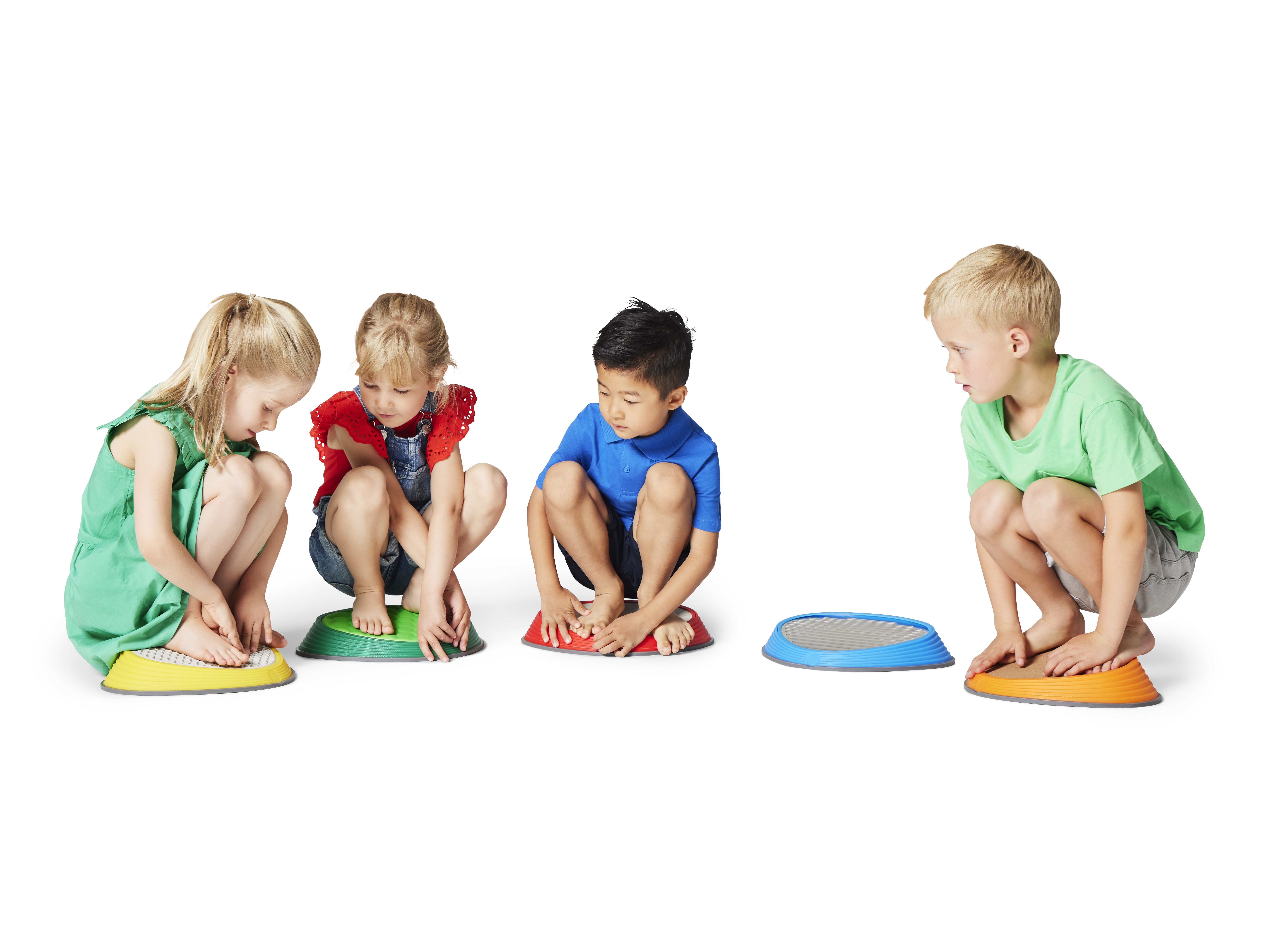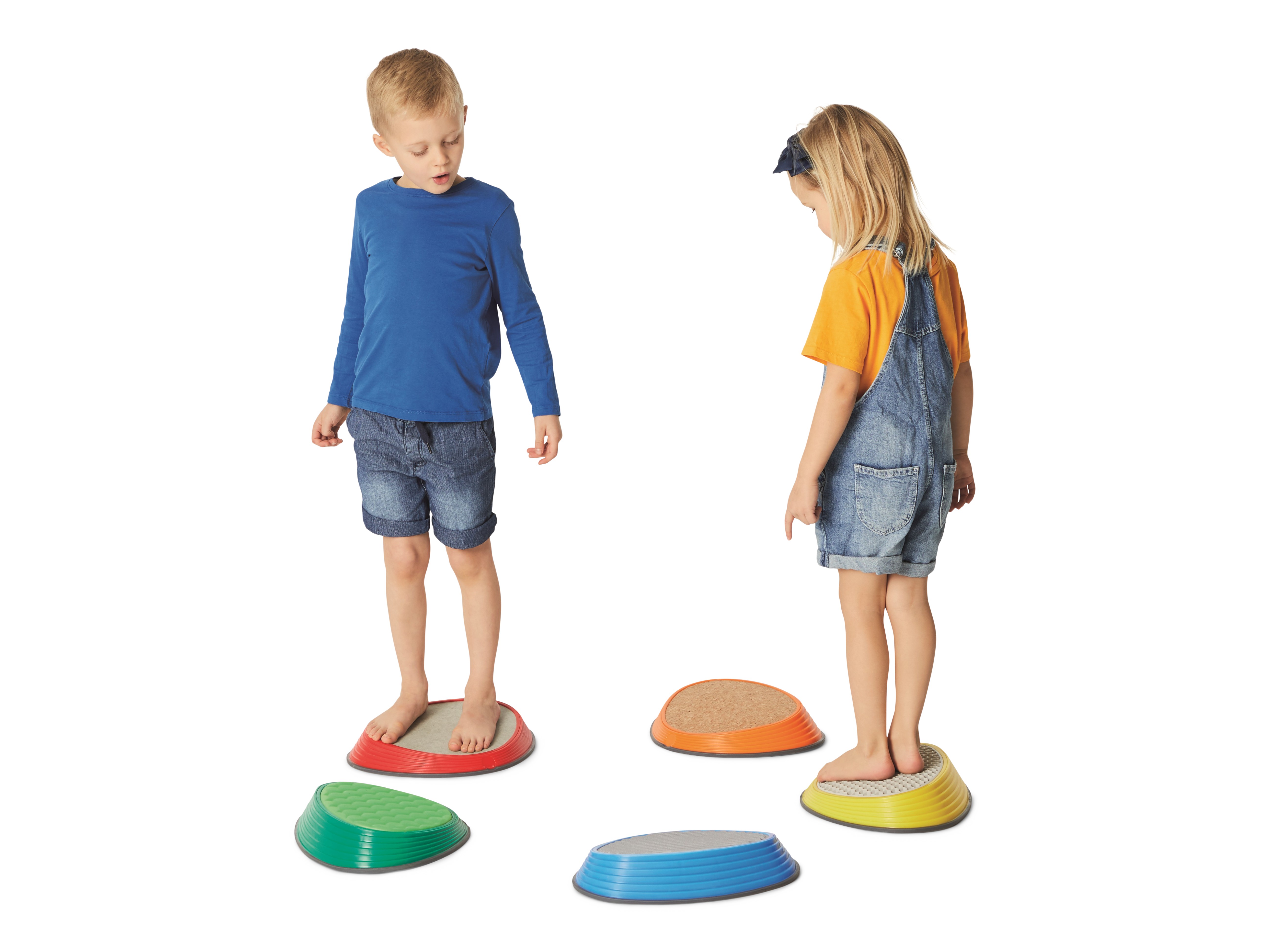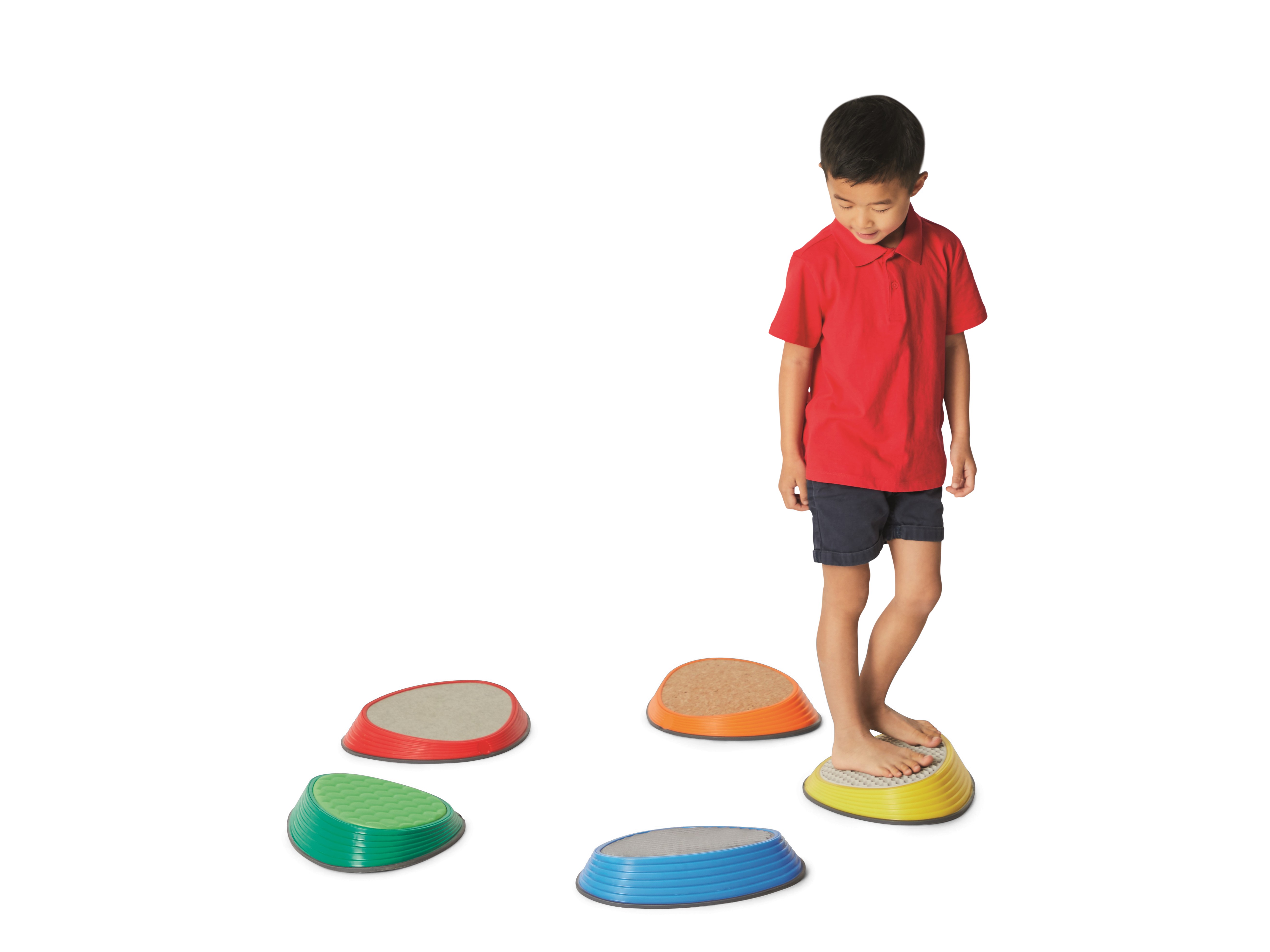 River Stones Tactile Set brings five distinct surfaces into one collection. Each stone features a different material—cork, aluminium, foam, TPE rubber, and concrete—selected for clear contrasts in firmness, temperature, texture, and grip. This variety engages tactile receptors in feet and hands, sharpening discrimination and encouraging confident foot placement. A gentle slope increases forefoot pressure to amplify sensory feedback and support balance, alignment, and motor control. Suitable for free exploration and structured training, the set integrates naturally into play spaces, therapy rooms, and PE sessions.