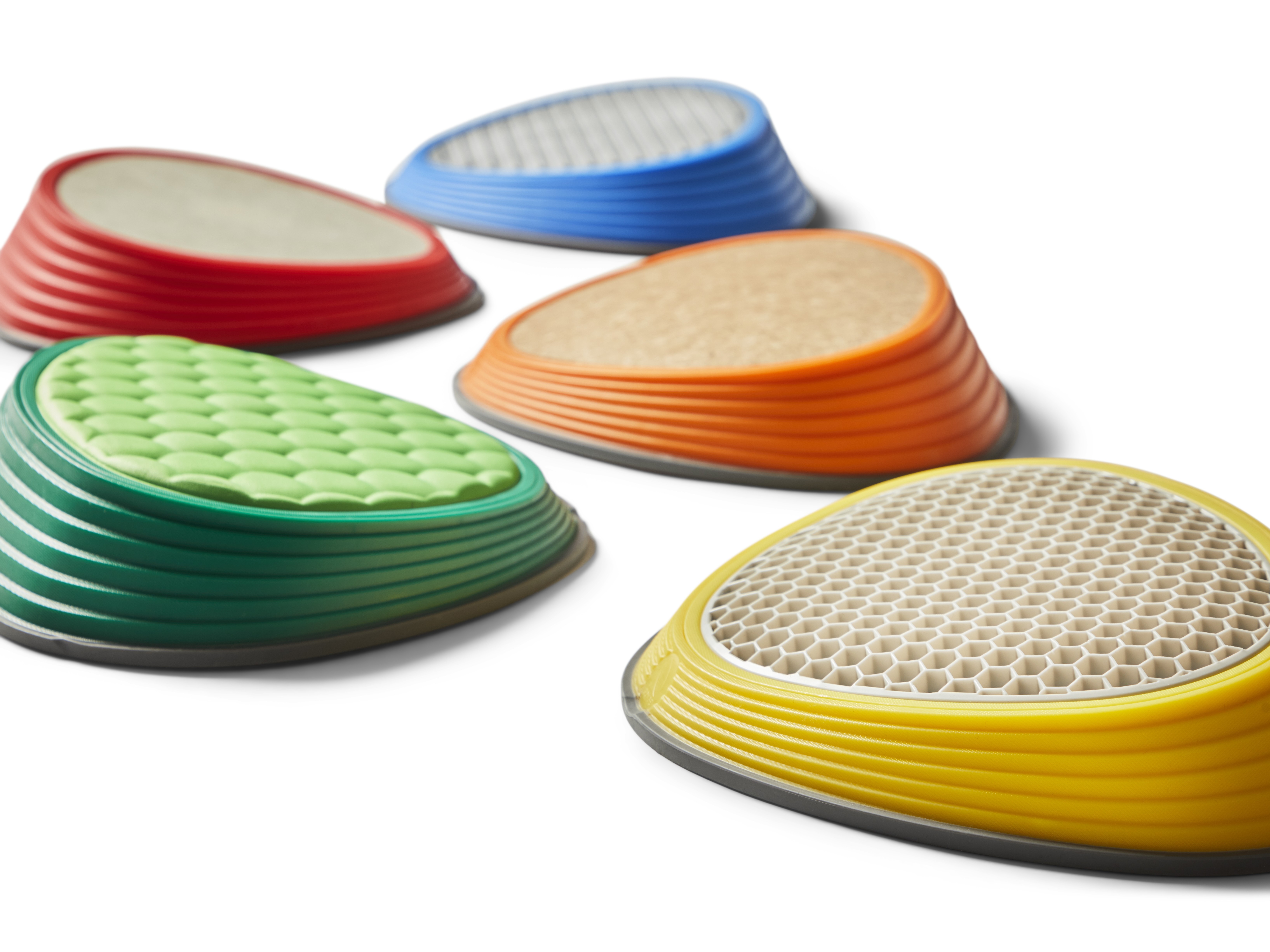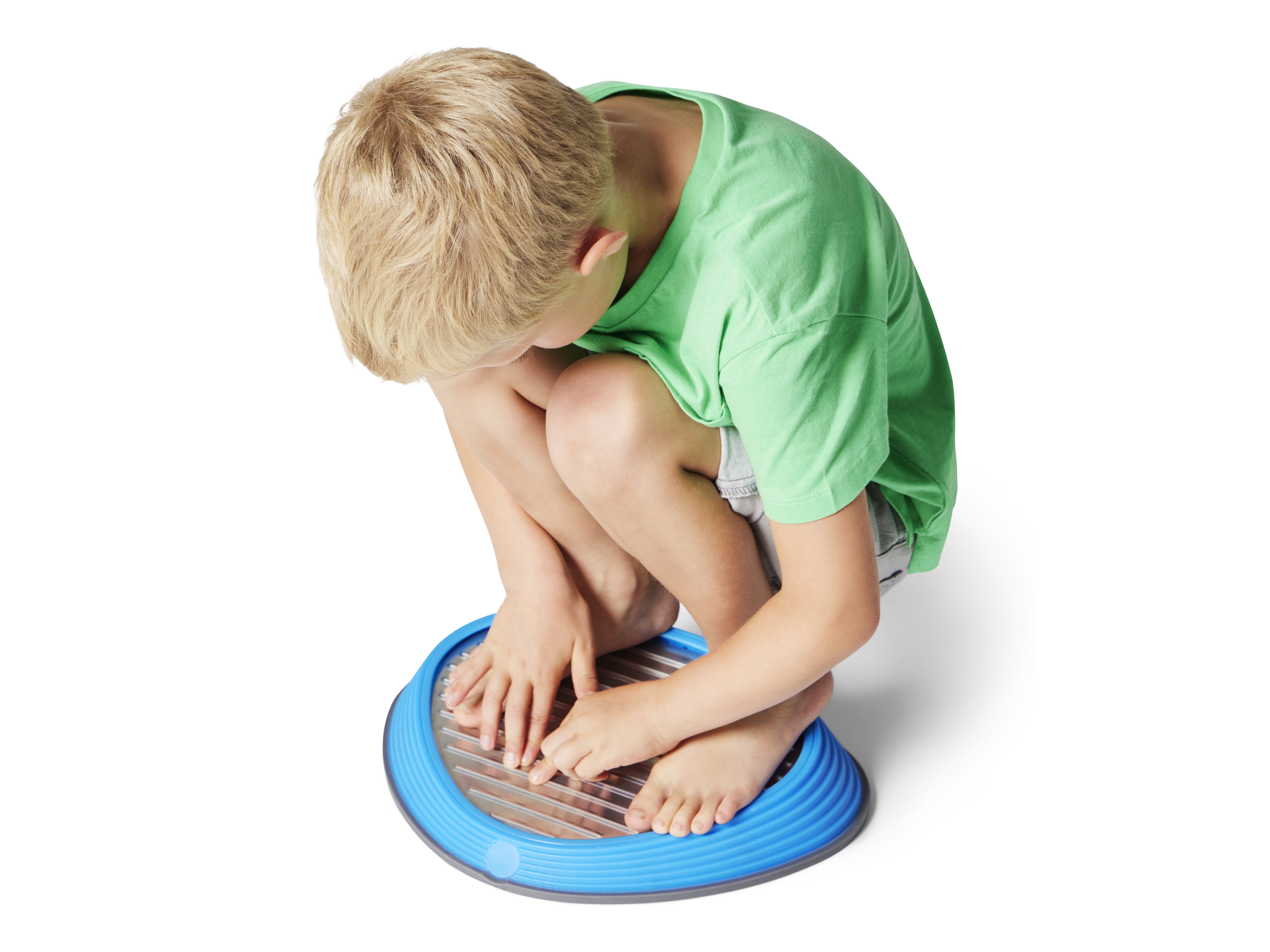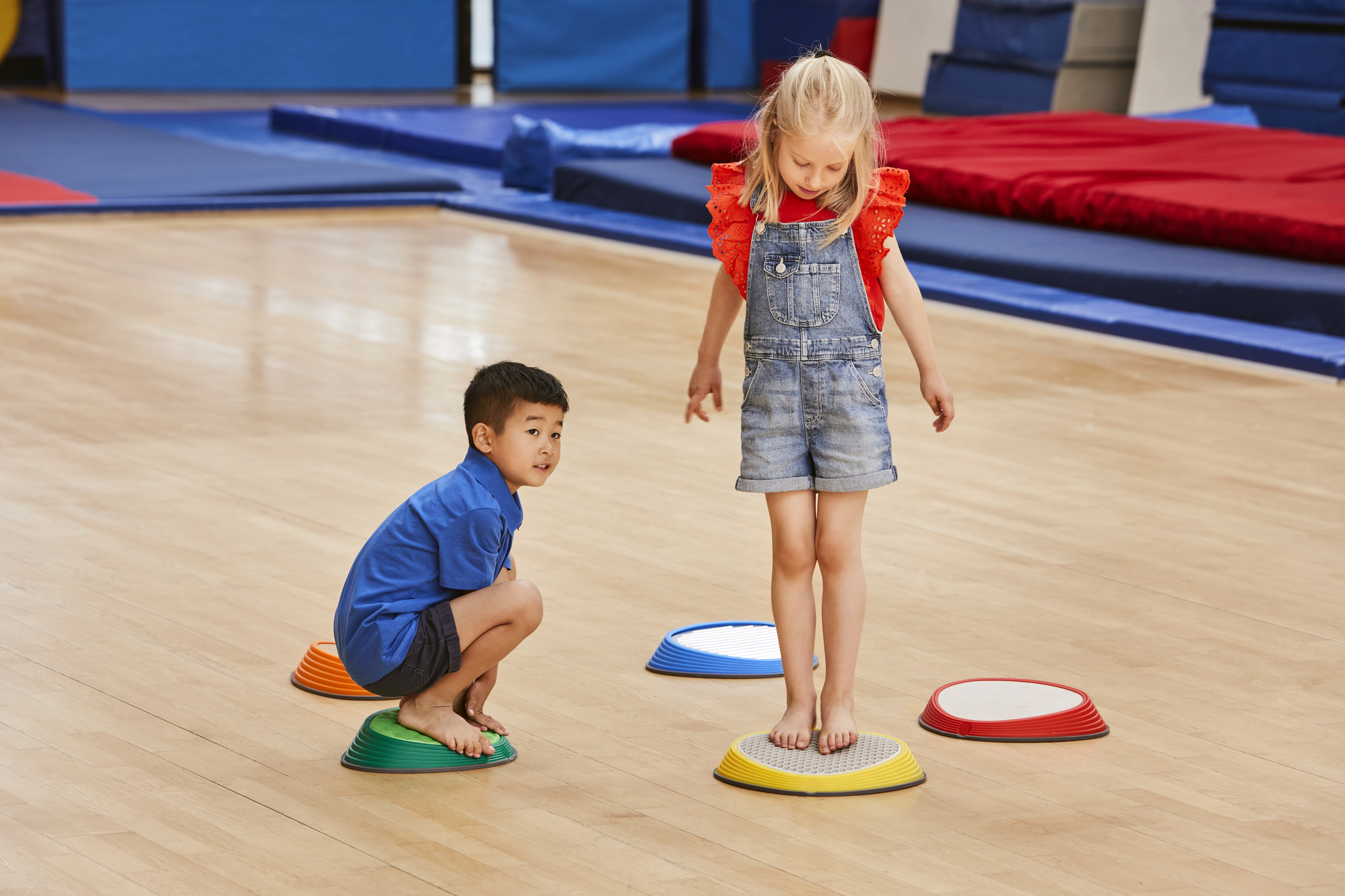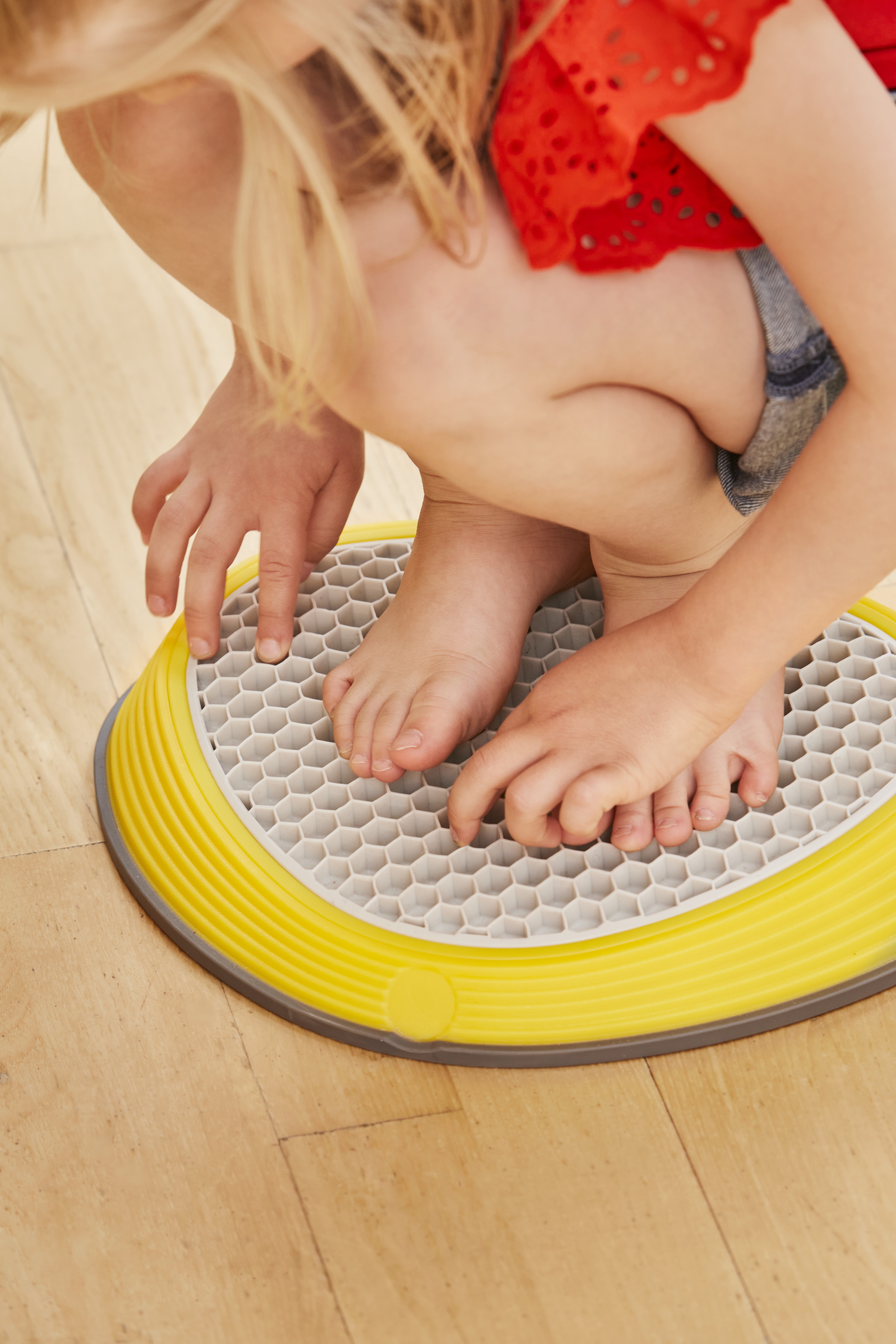 River Stones Tactile Set brings five distinct surfaces into one collection. Each stone features a different material—cork, aluminium, foam, TPE rubber, and concrete—selected for clear contrasts in firmness, temperature, texture, and grip. This variety engages tactile receptors in feet and hands, sharpening discrimination and encouraging confident foot placement. A gentle slope increases forefoot pressure to amplify sensory feedback and support balance, alignment, and motor control. Suitable for free exploration and structured training, the set integrates naturally into play spaces, therapy rooms, and PE sessions.